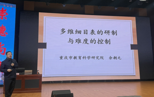 下午,重庆市教育科学研究院基础教育科学研究所所长余朝元老师带来了《多维细目表的拟制》讲座。余老师在中学课程、教材、教学、考试评价等方面有深入研究。他围绕新高考命题改革方向,重点讲解了多维细目表研制与试题难度控制两大核心命题环节。余老师将多维细目表定义为“命题蓝图”,介绍了其性质、误区、八大核心要素及编制使用流程。同时,他分析了影响试题难度的因素,并给出了难度设置与调整方法。最后,余老师布置了实践任务,要求以学科小组为单位研制多维细目表,以便下次培训展示交流。