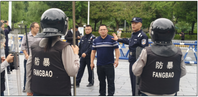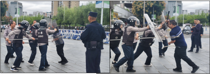 接到“警报”后,保安团队在庞威副主任指挥及警官现场指导下,迅速穿戴防爆装备,手持盾牌、橡胶棍抵达现场,快速形成防御阵型:两人用盾牌阻挡 “暴徒”进攻,一人抓住时机控制“暴徒”肢体,其余人疏散周边模拟师生,整个过程紧张有序、配合默契,短时间内成功“制服歹徒”,化解危机。