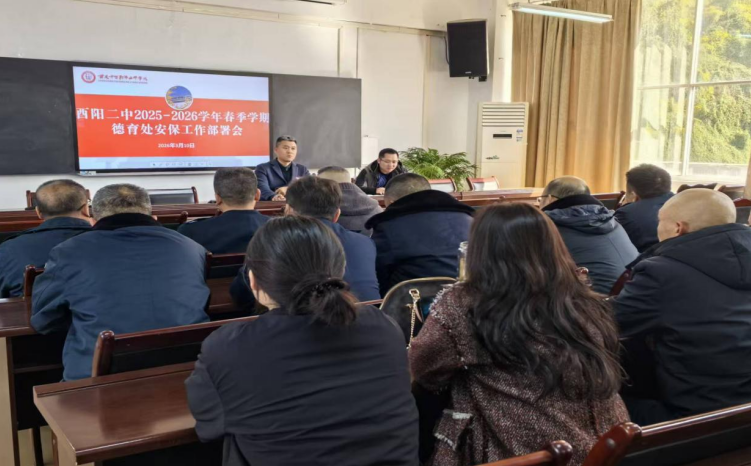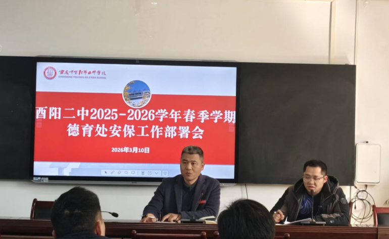 为深入践行“崇德尚实、追高求精”校训精神,筑牢校园安全发展根基,护航学校高质量发展 “三度”管理目标落地,酉阳二中德育处于2026年3月10日召开2025-2026学年春期安保工作专题会议。吴小华主席、德育处赵洪明主任、李鸿飞主任出席会议并讲话,全体校园专职保安参加会议。