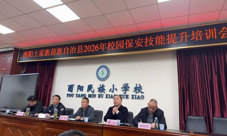 近日,酉阳土家族苗族自治县2026年校园保安技能提升培训会隆重召开,旨在全面提升校园保安队伍专业素养与应急处置能力,筑牢校园安全第一道防线。县教委、县公安局、县治安大队相关领导,保安公司负责人及全县校园安保人员代表参会,酉阳二中全体安保人员全程积极参与。