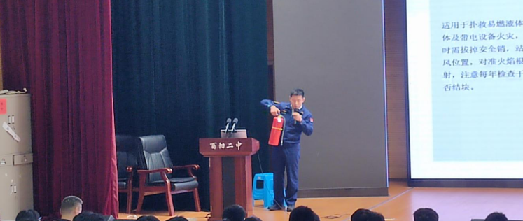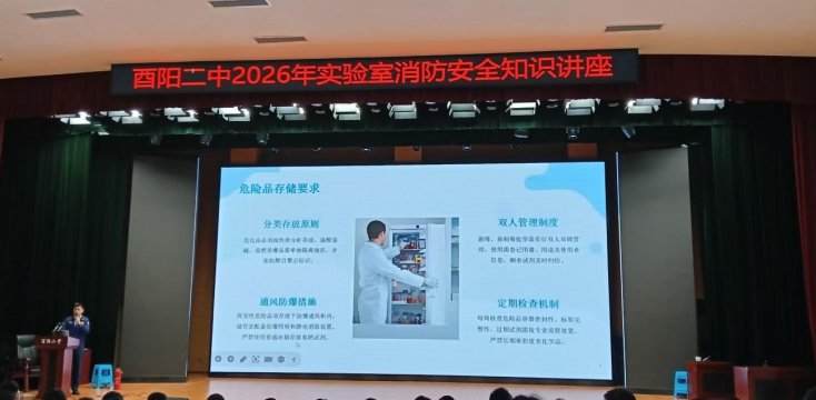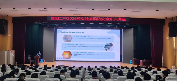 为深入贯彻“安全第一、预防为主、综合治理”的校园安全工作方针,切实强化实验室安全管理,提升师生消防安全应急处置能力,2026年3月26日下午,酉阳二中隆重召开实验室消防安全知识专题讲座。本次活动由德育处主任赵洪明主持,德育处副主任申佳乐、全体实验室老师及相关师生代表参会。酉阳消防救援大队张仕鑫参谋担任主讲人,通过“理论讲解+实操演练+互动问答”的多元形式,为全校实验室安全工作筑牢根基。