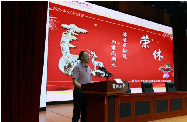 在热烈的掌声中,退休教师代表梁时贵老师发表了荣休感言。他回顾了自1987年进入二中工作以来,耕耘三十八载春秋,与学校同呼吸、共命运的难忘历程。梁老师表示,尽管离开了教学一线,但心永远会与二中在一起,会时刻关注并祝福学校未来的发展。