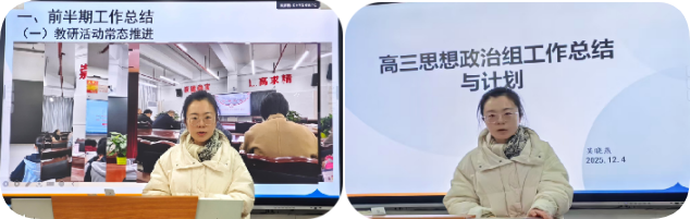 前半期完成选必一《经济全球化》及必修四哲学教学,即将收尾文化部分;实行分组出题保障 “每周一练”,落实背诵清单,开展12次集体备课,田璐璐、何娜老师获六校联盟教学竞赛冠亚军,组织“新闻时评”“非遗调查”活动。后半期将完成《文化生活》教学,推进选必二课程,整理结业考试清单,总结活动经验形成校本案例,培养年轻教师。