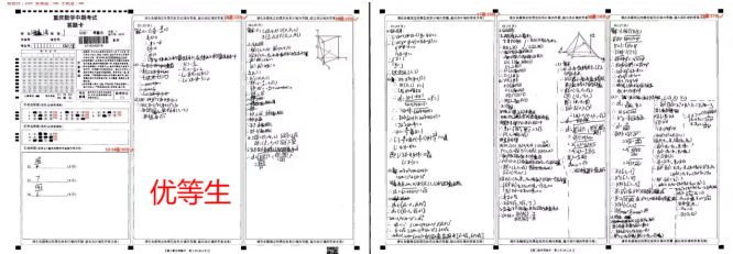 通过对比优等生,中等生,后进生的答题卡,可以发现优等生正确率高;步骤完整、逻辑清晰,关键公式标注明确;字迹工整,分区明确,修改痕迹少;合理分配时间,完成所有题目并检查。中等生基础题正确,中等题部分错误,难题难以突破;步骤基本完整,逻辑链条偶尔断裂,导致答案错误;局部涂改,书写较工整但偶有潦草。后进生基础题错误多,中难题空白或明显错误;步骤混乱;字迹难以辨认;后半部分答题乱写甚至是空白。