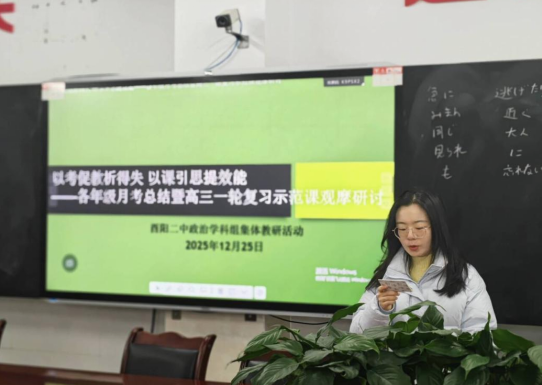 2025年12月25日,酉阳二中高一、高二、高三全体政治教师齐聚一堂,共同开展“以考促教学得析,以课引思想效能”的集体大教研活动,此次活动分为各年级月考总结和高三一轮复习公开课观摩研讨两大环节。