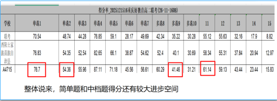 田沿阳老师首先对本次联考进行了多维度复盘。他在肯定前期教学成效的同时,尖锐指出:与上月相比,本次考试优生梯队排名出现整体性滑落。究其根源,教学进度与联考范围存在结构性错位是主因。部分章节学习时间过早,导致学生知识遗忘率增高,影响了应试发挥。