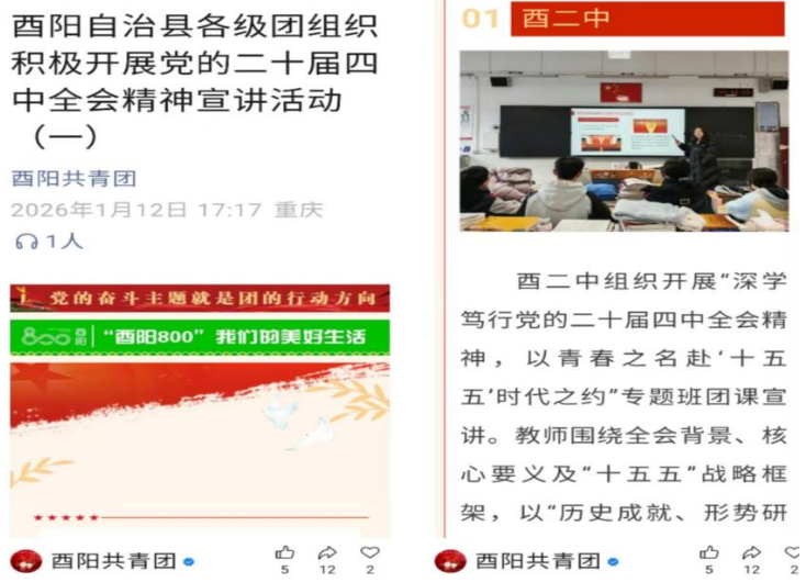 为深入学习贯彻党的二十届四中全会精神,引导青年学生深刻把握“十五五”时期国家发展的战略部署与时代使命,酉阳二中高2027届政治组于2025年12月到2026年1月面向全体学生组织开展了题为“深学笃行二十届四中全会精神,以青春之名赴‘十五五’时代之约”的专题班团课宣讲活动。本次活动立足政治学科专业优势,注重理论联系实际,同步启动“聚焦时代脉搏·彰显青年担当”新闻时评大赛,推动全会精神入脑入心、见行见效。
