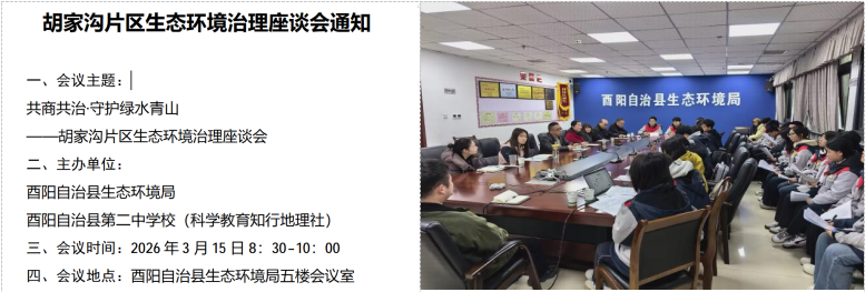 为深入践行生态文明教育理念,推动地理学科核心素养培育与科学实践育人有机融合,酉阳二中知行地理社团依托校本实践课程,组织学生深入胡家沟片区开展生态环境专题调研。2026年3月15日上午,在酉阳县生态环境局五楼会议室,社团师生代表与县生态环境局、县住建委、桃花源街道、城北社区、三峰集团相关领导和负责人共同召开“胡家沟片区生态环境治理座谈会”。会议由县生态环境局主办,酉阳二中协办,围绕“共商共治·守护绿水青山”主题展开深入交流,取得良好育人实效与初步共治成果。
