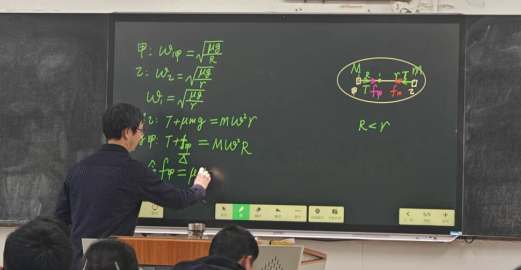 针对“连接体临界问题”这一教学难点,陈高飞老师采用“分步推进”策略。他在黑板上画出两个物体通过轻绳连接、随圆盘转动的示意图,引导学生先分析当角速度较小时两物体的受力情况,再逐步增大角速度,追问:“随着角速度增大,哪个物体先达到临界?绳子的拉力何时出现?出现后两物体的受力如何变化?”他带领学生一步步分析静摩擦力与绳子拉力的“接力”过程,并用板书清晰记录不同角速度区间内的受力情况。