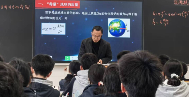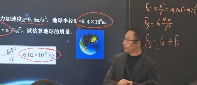 进入新课教学环节,梁泽盛老师首先以地球为例,引导学生分析地球表面物体所受重力与万有引力的关系。他指出,忽略地球自转影响时,地面上的物体所受重力近似等于地球对它的万有引力,即mg = G·M·m/R²。由此推导出地球质量的表达式M=g·R²/G。梁泽盛老师特别强调,这种“黄金代换法”思路简洁,只要知道天体表面的重力加速度和天体半径,就能求出该天体的质量。他通过具体数值代入——取g=9.8 m/s²,地球半径 R = 6.4×10⁶ m,引力常量G= 6.67×10⁻¹¹ N·m²/kg²——计算出地球质量约为6×10²⁴kg,让学生直观感受到理论计算的强大力量。