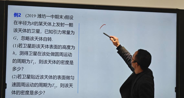在密度计算的教学环节,梁泽盛老师从质量表达式出发,结合球体体积公式V = (4/3)πR³,引导学生推导天体平均密度的计算公式。他分两种情况展开讲解:第一种情况,若已知天体表面的重力加速度 g和半径R,由M=gR²/G可得密度ρ= M/V =3g/(4πGR)。第二种情况,若已知环绕天体绕中心天体做匀速圆周运动的周期 T 和轨道半径 r,以及中心天体自身的半径 R,则有ρ= 3πr³/(G·T²·R³)。梁泽盛老师特别指出一个特殊情形:当环绕天体在中心天体表面附近运行时(即近地卫星),轨道半径 r 近似等于中心天体半径 R,此时密度公式简化为ρ=3π/(G·T²),只需测定近地卫星的周期即可估算中心天体的平均密度。他通过具体例题让学生代入数值计算,进一步加深对公式的理解与记忆。