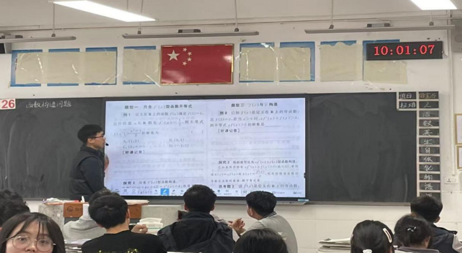 公开课伊始,程先波老师结合高2027届学生的学情特点,以高考考情为切入点,开篇明确函数构造问题在导函数大题、压轴小题中的高频考查形式与分值占比,用简洁明了的语言点明该知识点对学生提升数学成绩、培养逻辑思维的重要性,快速吸引学生注意力,顺利导入课堂主题。课堂开篇环节,程老师思路清晰、节奏明快,充分展现了青年教师扎实的专业功底和良好的课堂把控能力。