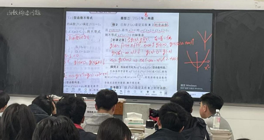 为充分发挥学生的主体作用,程先波老师采用“例题讲解—小组讨论—成果展示—点评总结”的教学模式,让学生主动参与课堂探究。针对难度适中的题型,他组织学生分组讨论,鼓励学生大胆分享自己的构造思路,小组内相互补充、相互完善;针对复杂题型,他不直接给出答案,而是通过层层设问、逐步引导,启发学生逆向思考,自主分析导函数结构,尝试构造新函数,有效培养了学生的逻辑推理与逆向思维能力。同时,程老师密切关注学生的答题反馈,对学生出现的问题及时点评、针对性讲解,规范学生的答题流程,引导学生举一反三,实现“学会一道题、掌握一类题”的教学目标。