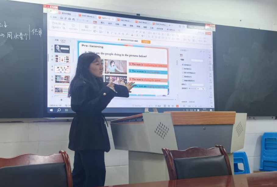 1.听说课(Pre-listening & Listening)冉婷老师以“乐器认知”为导入,通过图片、互动问答激活学生已有词汇储备,搭建“conduct an orchestra, play the guqin”等核心表达的语言支架;听力环节设计分层任务,从细节捕捉到主旨归纳,逐步引导学生掌握听力策略,同时融入中国传统乐器介绍,实现语言训练与文化渗透的融合。
