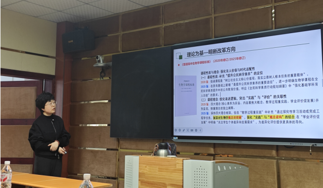 上午10时,生物学科活动于录播室同步开启。东营一中正高级教师、齐鲁名师王舒老师以“理论为基、研析真题、导向教学”为主线,为全体生物教师带来一场高密度、强实操的专题讲座。王老师立足课程标准与高考评价体系,深入阐释“一核四层四翼”命题逻辑,梳理近年命题从“强化关键能力”向“融入科技前沿、强化真实情境、提升探究开放”的改革走向。结合近六年山东高考真题,她以详实数据揭示试题“情境简化、阅读减量、表达聚焦、能力拔高”的鲜明特点,并围绕神经调节、遗传规律、基因工程等高频模块,拆解核心考点的命题逻辑。