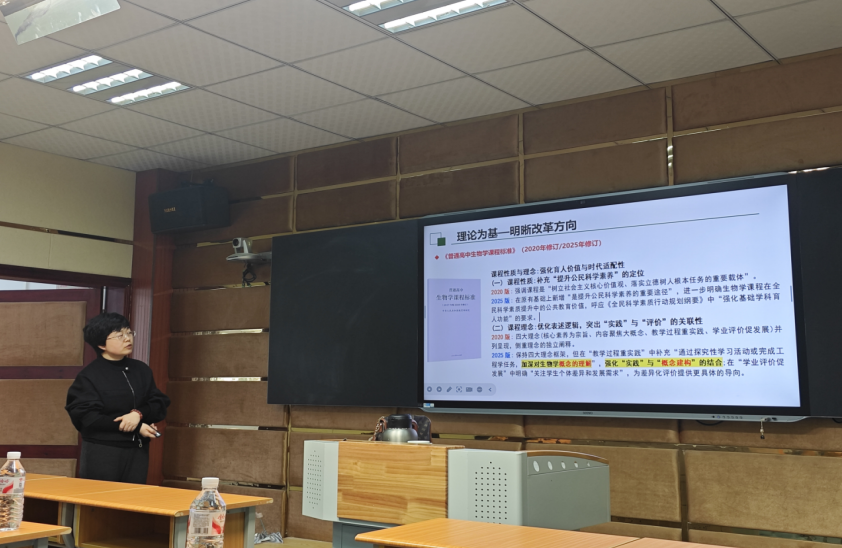 专题讲座中,王舒老师以“理论为基—明晰改革方向、研析真题—领悟命题规律、导向教学—精准高效备考”为框架,完整呈现高考生物备考的系统思路。她首先立足《普通高中生物学课程标准》与《中国高考评价体系》,深入解读“一核四层四翼” 命题内核,明确核心价值、学科素养、关键能力、必备知识的考查逻辑,以及基础性、综合性、应用性、创新性的考查要求。结合2020-2026年教育部高考命题工作文件,王老师系统梳理命题要求的细微变化,清晰指出高考生物从“强化关键能力考查”到“融入科技前沿、强化真实情境、提升探究开放” 的改革走向,强调高考命题持续弱化机械记忆,突出知识融会贯通与灵活运用。