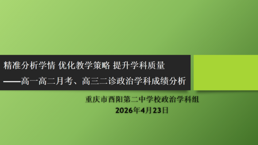 2026年4月23日上午,酉阳二中高2026届、高2027届政治学科组在奋飞楼北213会议室召开集体备课活动,主题为“精准分析学情、优化教学策略、提升学科质量”,高2026届与高2027届全体政治教师参会,活动由叶小燕老师主持。
