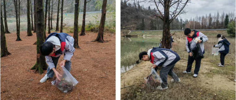 没有指令,无需号召,同学们不约而同地拿出随身携带的塑料袋,主动投身到垃圾清理中。他们俯身于枯黄的草丛间,伸手探入林木深处,仔细拾起塑料瓶、食品包装、废纸屑等各类废弃物。指尖沾染泥土,裤脚蹭上草屑,凛冽的寒风刮红了脸颊,却没有一人停下脚步——这份从心灵深处生发出的对生态环境的珍视,让“弯腰捡垃圾”不再是简单的动作,而是对自然的敬畏、对文明的践行。更让人动容的是,因韦家槽打卡地内未设置垃圾回收处,同学们便将装满垃圾的袋子仔细捆紧,悉数搬到随行车辆的后备箱中,计划返程时带到附近的垃圾站进行规范丢弃,用细致的行动将环保做到了实处。