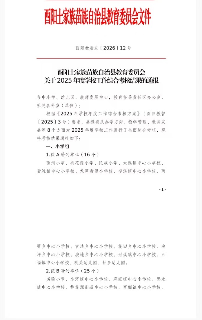 热烈祝贺我校在酉阳县2025年度学校工作综合考核中荣获“中学一类第一名”!