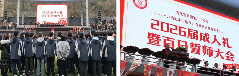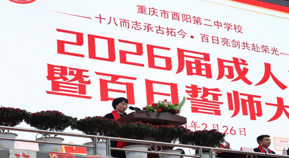 18岁,是青春的起点,是责任的担当;100天,是冲刺的号角,是胜利的前奏。为激发高三学子的备考斗志,增强责任担当意识,同时庆祝学生迈入成年行列,重庆市酉阳第二中学校于2026年2月26日下午3点在足球场隆重举行高三年级“成人礼暨百日誓师”活动,活动以“十八而志承古拓今·百日亮剑共赴荣光”为主题。