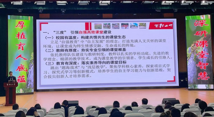 教务处主任黄贞杰以“三度引领、制度推动”为主题,部署“自强高效课堂”建设。一是以“校园有温度”构建共情共生课堂生态,以“教师有厚度”夯实专业引领根基,以“教育有深度”落实素养导向目标。二是依托制度保障,细化备课、上课、作业、辅导、考试各环节要求,规范教学行为。三是近期将组织教师完成高考真题研做及集体研讨,推动教学提质增效。
