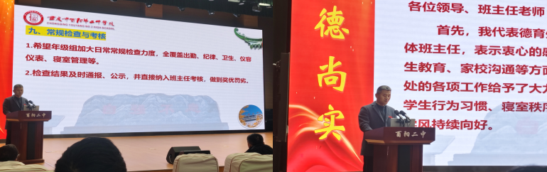 明确部署明方向,压实责任抓落实。德育处赵洪明主任充分肯定以往工作成效,并对照优质提升年目标,部署本学期十三项重点工作:规范就寝纪律与内务卫生;严格钉钉请假制度,做好单招学生离校管理;完善特殊体质学生跟踪;规范教育惩戒;加强班主任自身建设;主题班会由班主任亲自主持;门卫室不接收外卖及寄存行李;强化常规考核与结果通报;及时上报学生异动;明晰德育管理架构与职责;落实班级及年级组考核,按时上交材料;统筹推进本学期各项重点工作。
