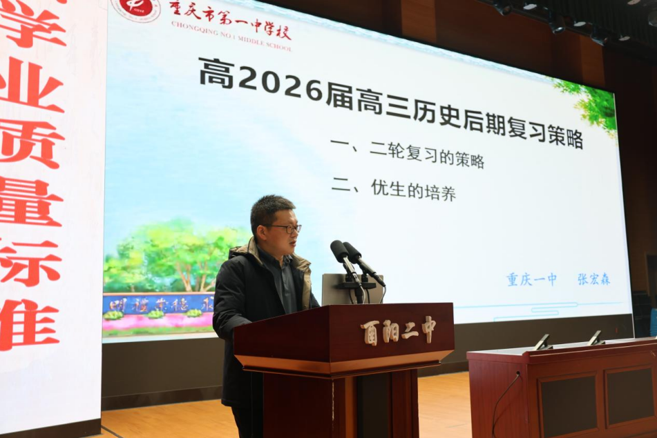 随后,由重庆市教育科学研究院基础教育科学研究所所长余朝元作专题指导。作为全市历史学科教研领军专家,余老师结合2026年高考命题趋势,围绕“2026届高三历史后期教学实施策略”做权威分享。他精准解读了高考历史命题的核心导向与考查重点,明确了高三历史教学的核心目标与关键任务,从专题整合的优化方法、解题思路的建模技巧、易错点的精准突破、综合能力的系统提升等方面,给出了系统性、可操作的教学建议,帮助全体参会教师厘清了后期教学思路、找准了实施重点,有效破解了课堂教学中的困惑,全场教师认真聆听、深入思考,收获颇丰。