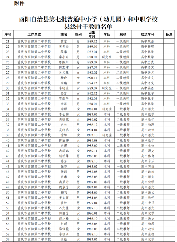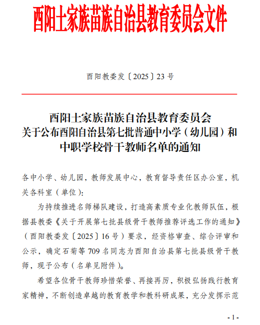 2025年,酉阳土家族苗族自治县教育委员会发布《关于公布酉阳自治县第七批县级骨干教师名单的通知》(酉阳教委发〔2025〕23号),我校共有黄东等39名优秀教师成功入选,人数位居全县第一。这一喜讯不仅是对教师个人专业能力的充分肯定,更是我校持续推进名师梯队建设、打造高素质专业化教师队伍的集中体现。